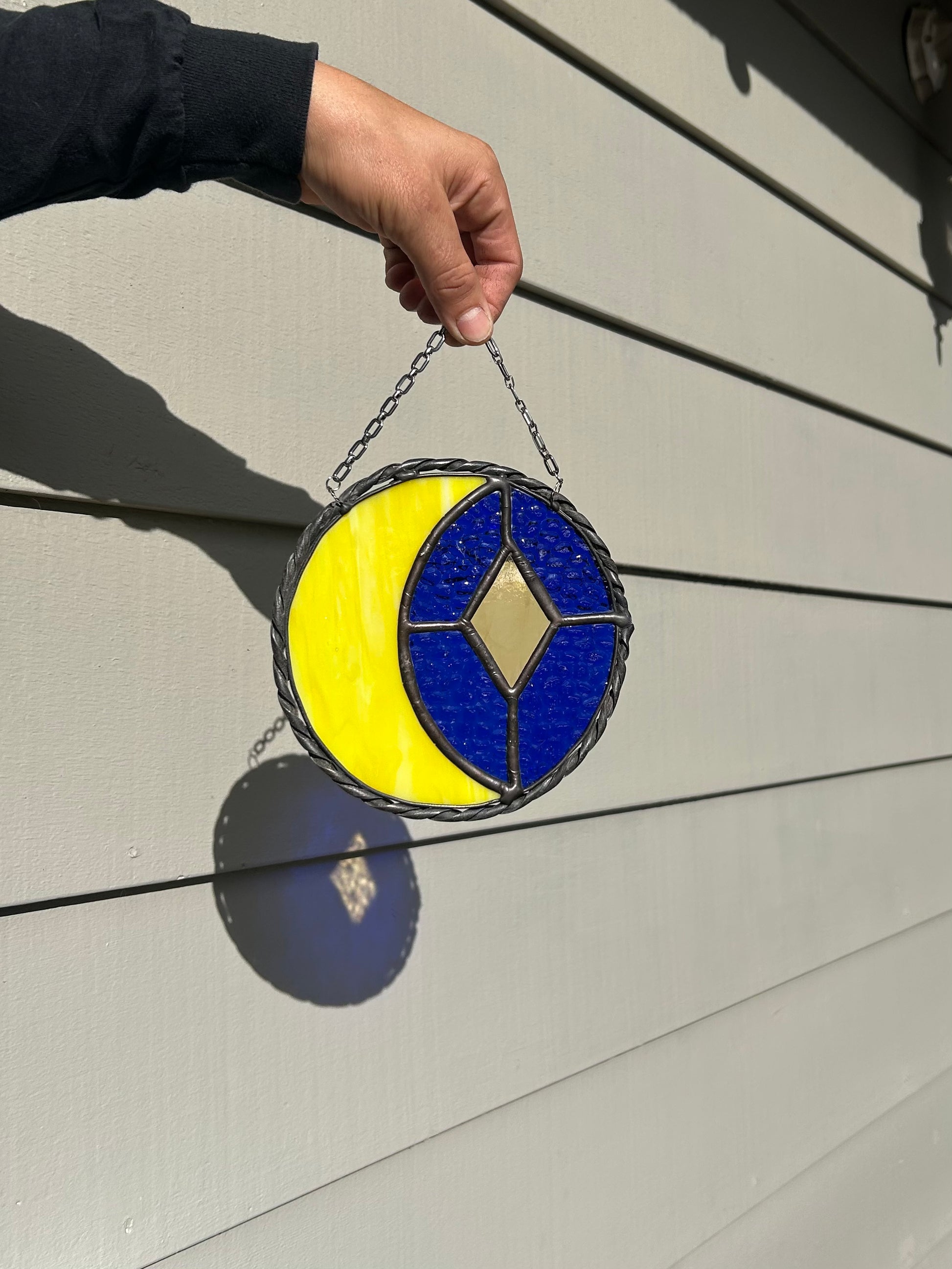 Moon guy. Smaller version of the two I've made. Comes polished and ready to hang. Dimensions are approximately 6.5"x6.5" and hangs about 2.5". Contains lead.